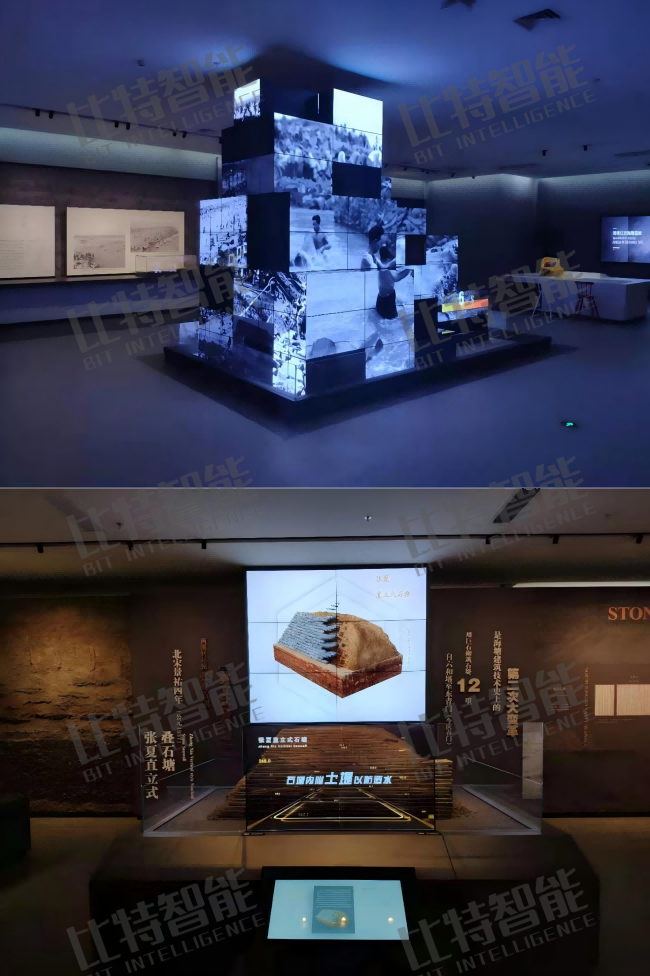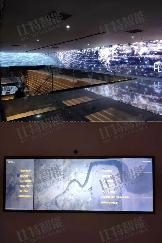 2、项目简介:整体项目采取高清高刷 LED 屏体现钱塘江海潮的汹涌。拼接屏互动,拼接屏联动,55 寸透明显示屏(单块 18 万),中控系统可以控制全馆多媒体设备的开关,以及视频进度, 音量控制, 同时可控制全馆灯光开关, 支持一键开馆, 一键闭馆。